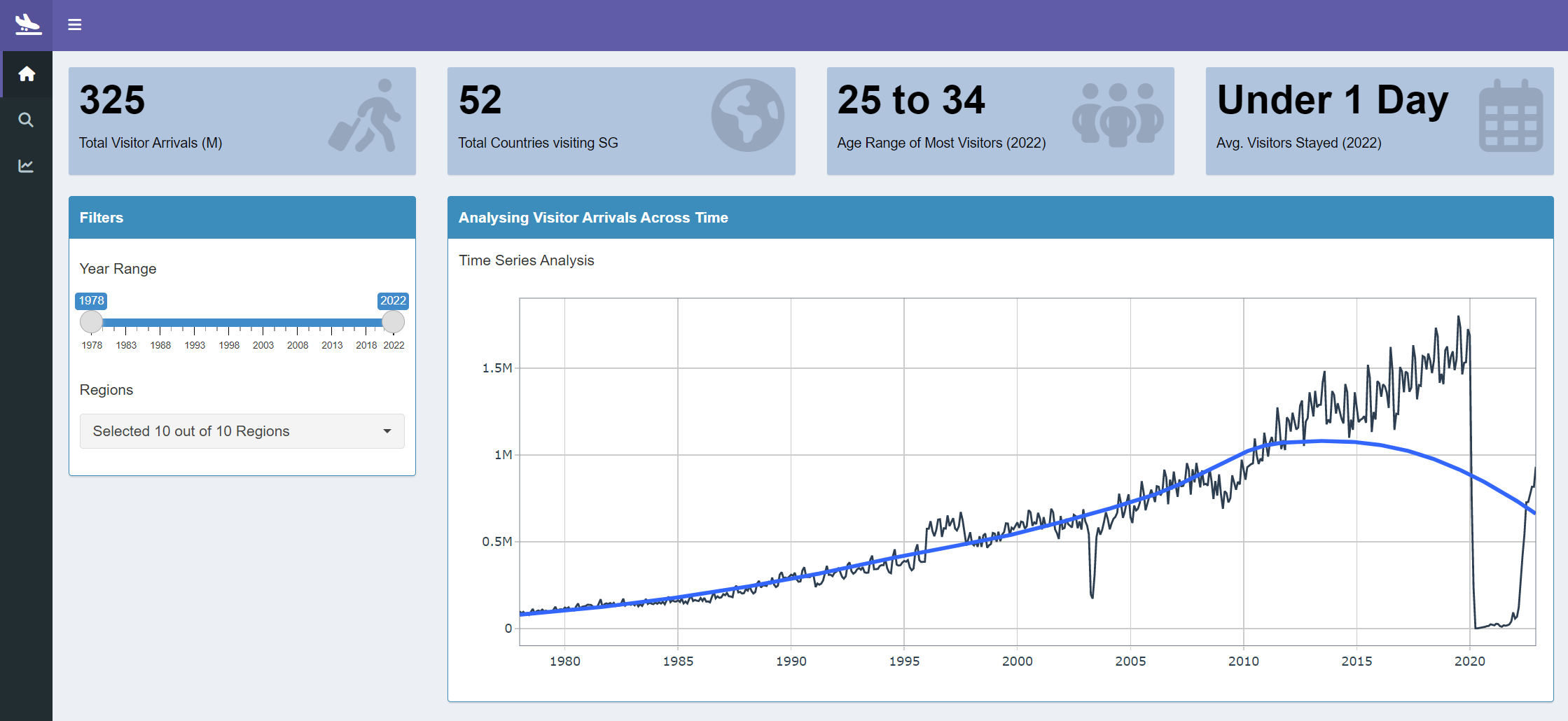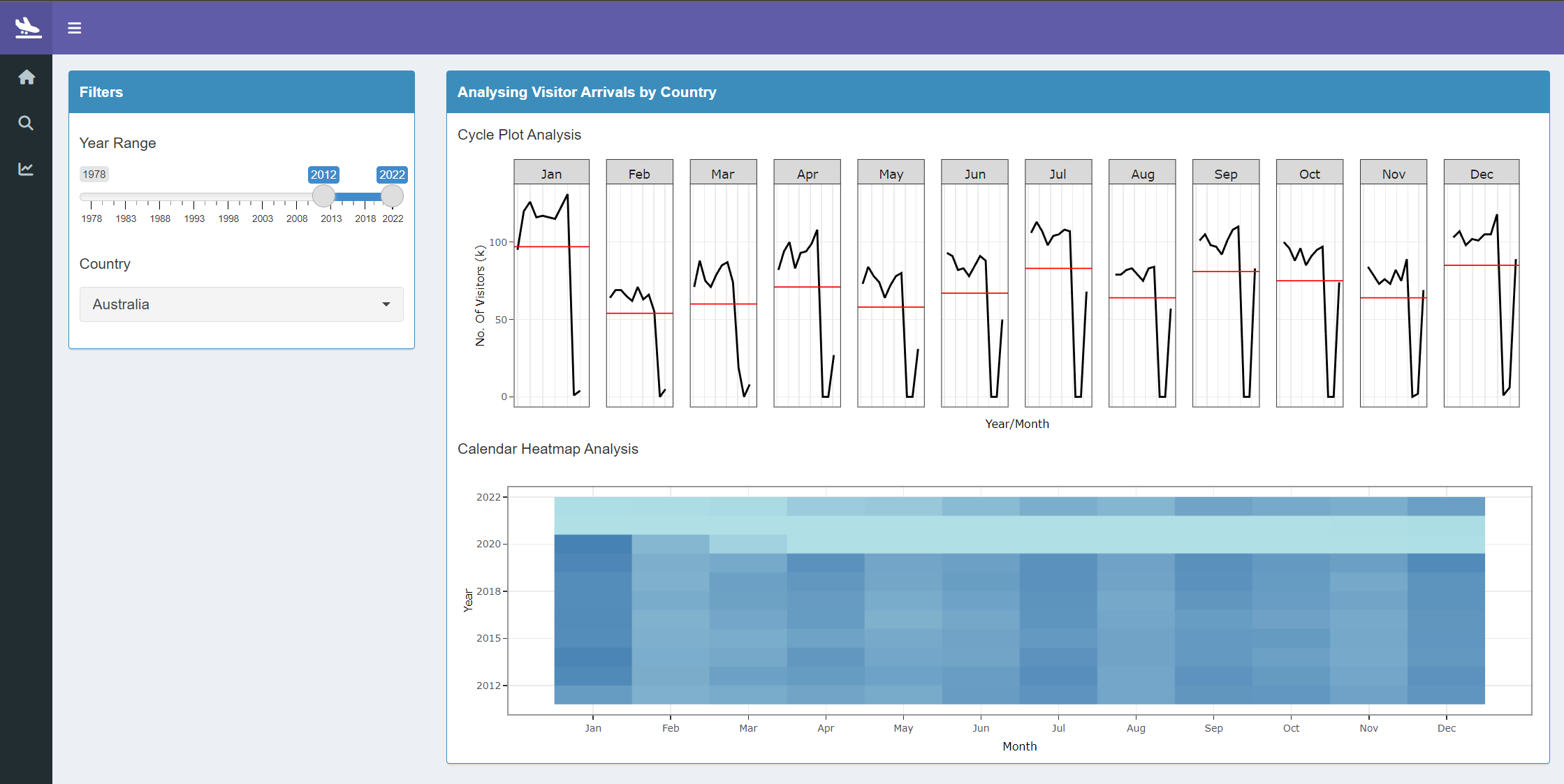Country. The default selection isAustralia. The filter is sorted in alphabetical order. If a country that you want to analyze is not included in the filter, it would mean that there is no record of a person from that country visiting Singapore.