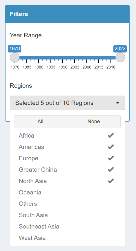 Year Rangeslider. The default year range is from1978to2022. - Next, choose a region to have a quick look into using the multi-select drop-down filter for