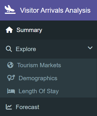There are three sub-sections for the explore section. These sections contain analysis on the Tourism Markets, the Demographics of Visitors as well the Length of Stay of these visitors.