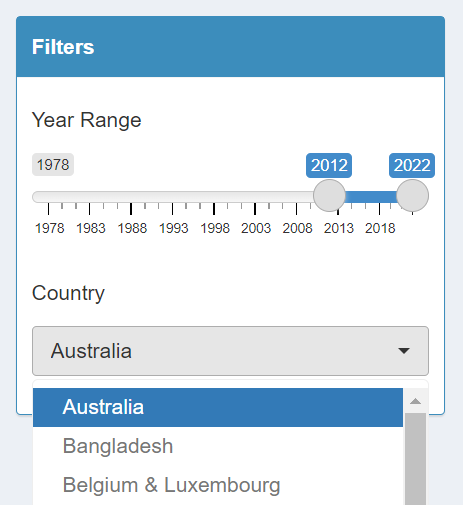 Year Rangeslider. The default year range is from2012to2022. - Next, choose a country to drill down into using the single-select drop-down filter for