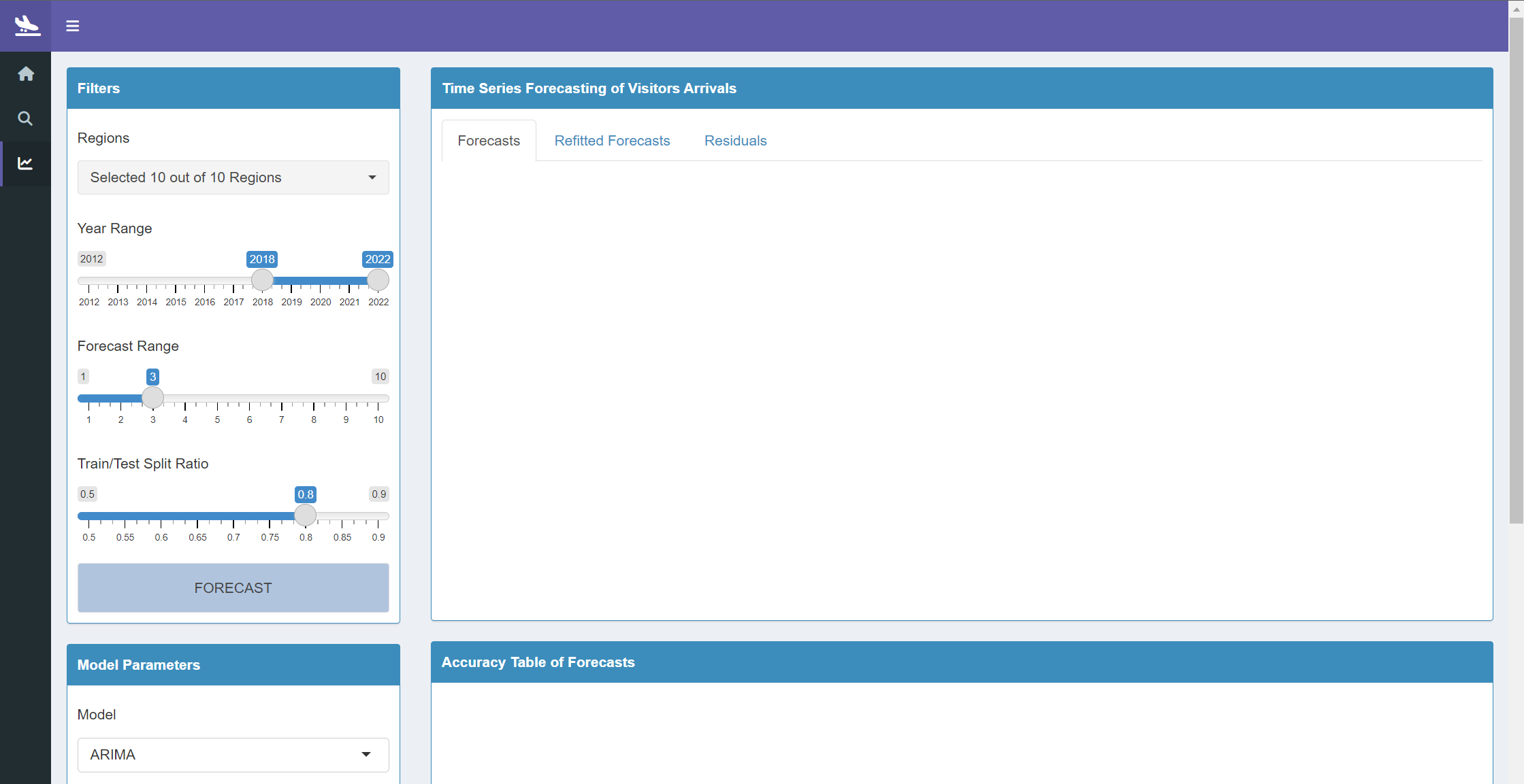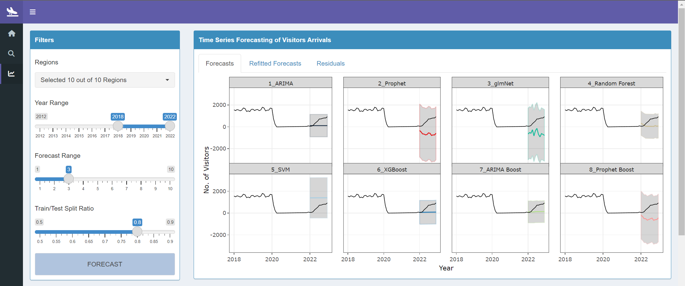a. Three tabs containing visualizations on the forecast model, refitted model and the residuals of the forecast can be viewed under the time series forecasting of visitor arrivals section