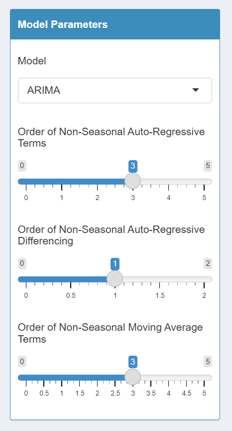 On top of filters, the forecast models’ parameters can be customizes for each of the available forecast models. The forecasting models are; ARIMA, Prophet, glmNet, Random Forest, SVM, XGBoost, ARIMA Boost and Prophet Boost.