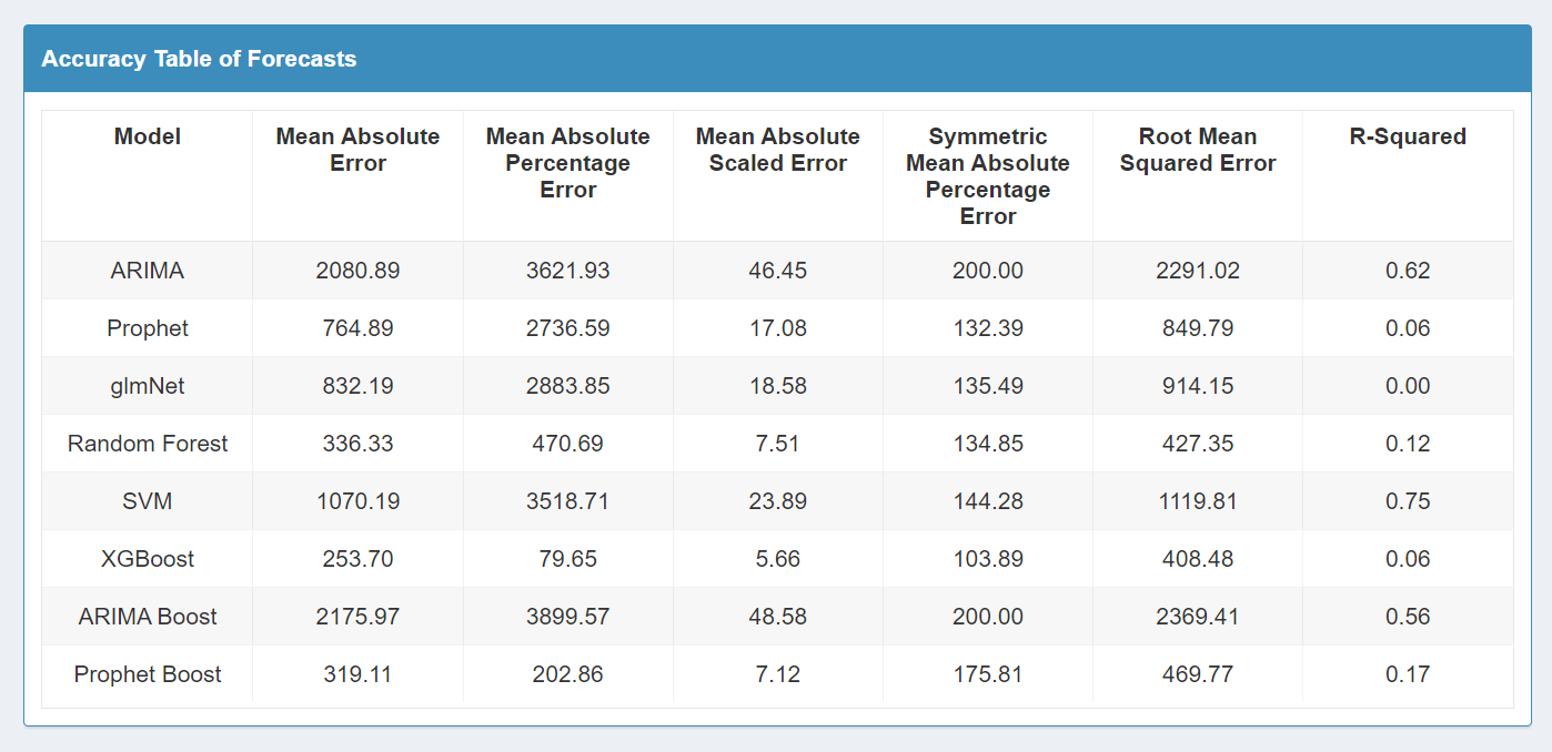 b. A table capturing the performance accuracy of each model will be displayed under the accuracy table of forecasts section